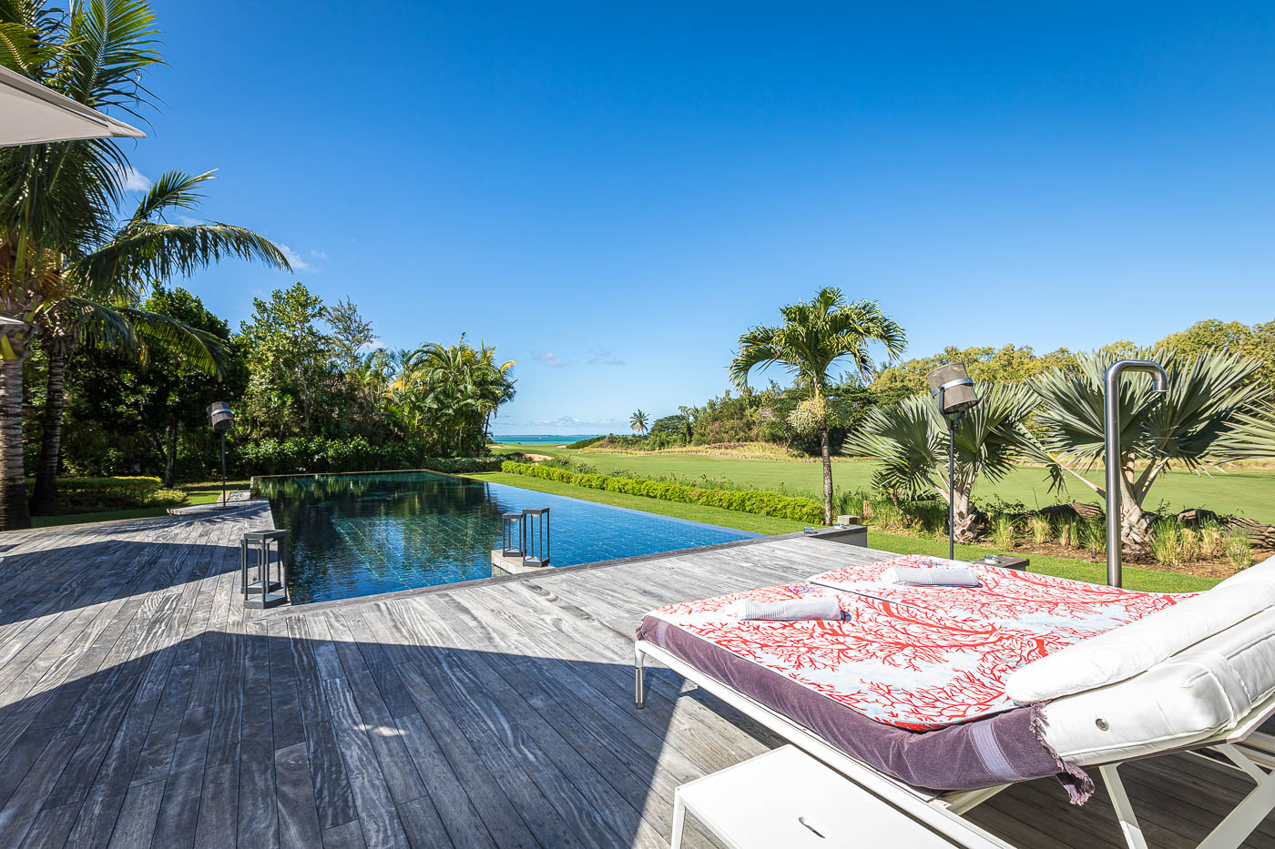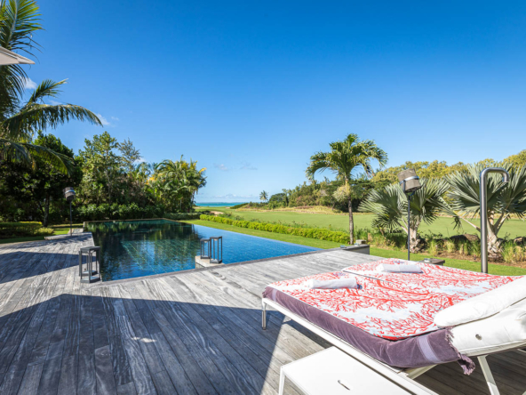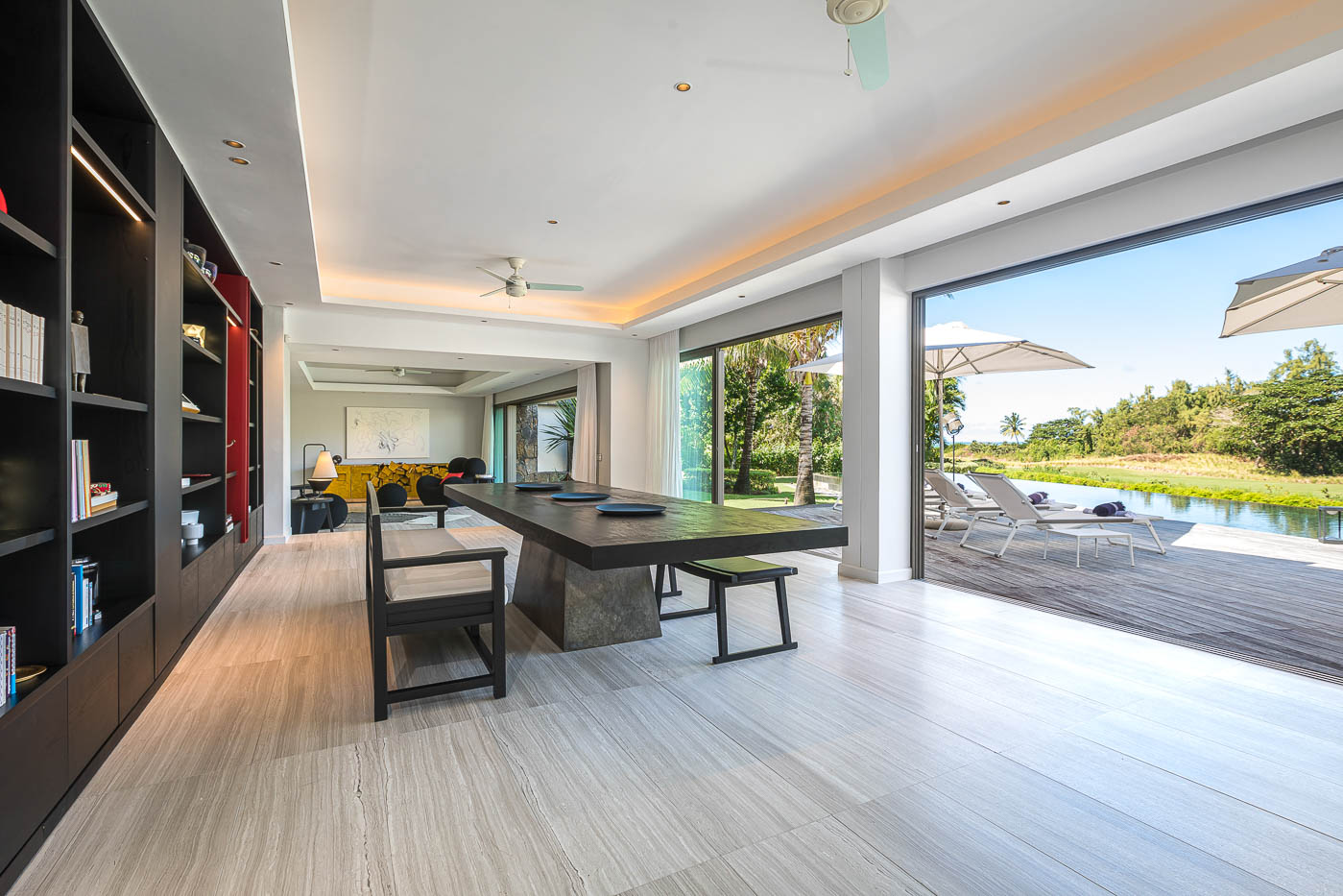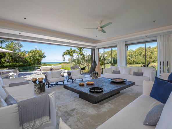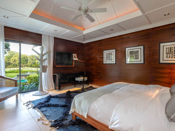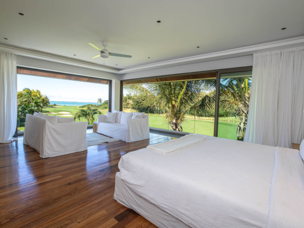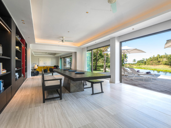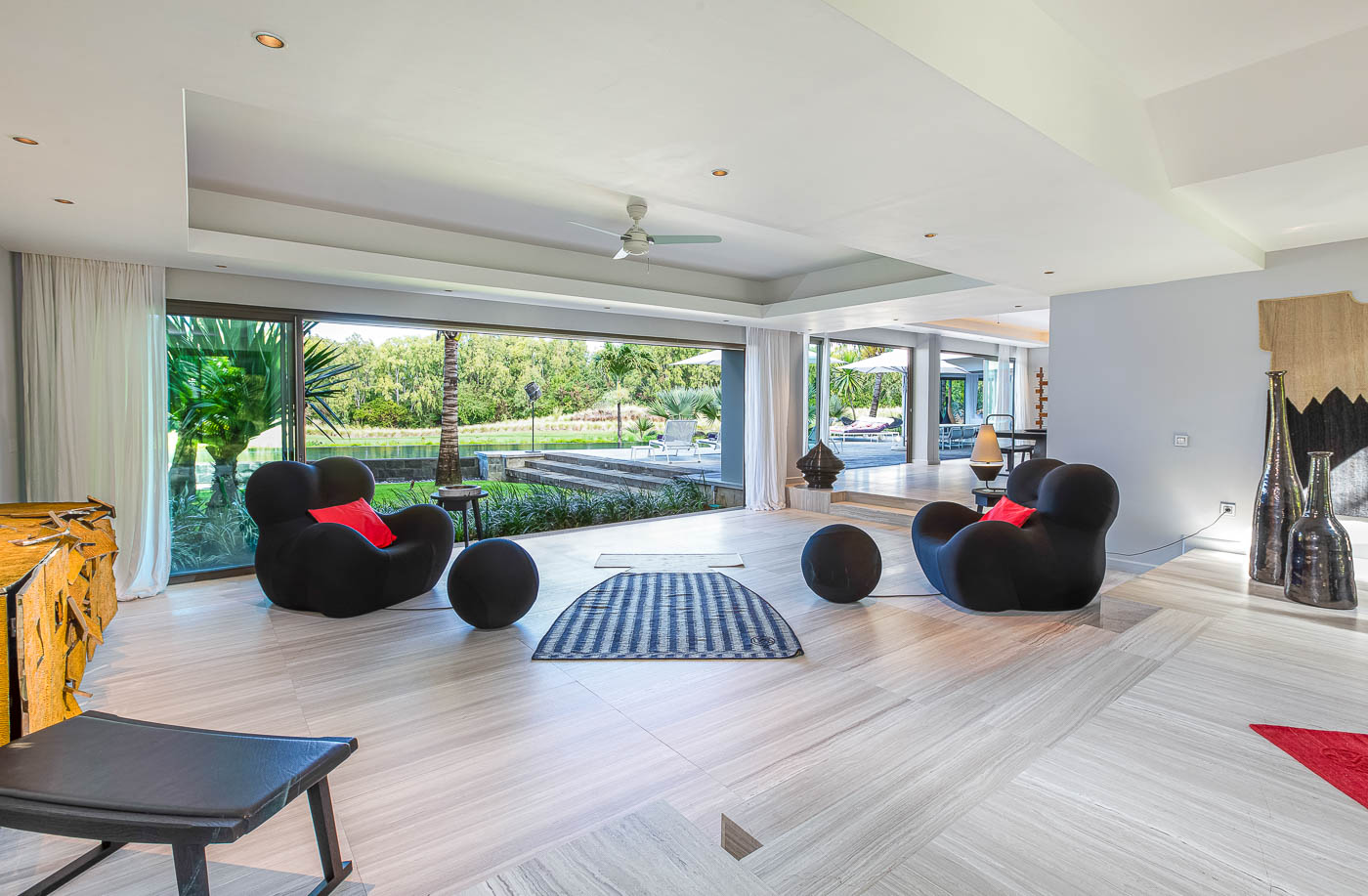 Récemment rénovée et subtilement agrandie, elle s’inscrit dans un environnement apaisant où les lignes modernes flirtent avec la végétation tropicale. Ses 589 m² habitables révèlent une composition élégante, entre matériaux nobles et volumes généreux. Depuis le salon ou la suite parentale de l’étage, le regard embrasse un tableau vivant : piscine à débordement de 15 mètres, nature verdoyante, quatrième trou du golf et, au loin, le lagon qui capte la lumière. L’intérieur conjugue sobriété contemporaine et touches artisanales. Marbre italien, mobilier de créateurs, œuvres choisies : chaque détail raconte une histoire d’harmonie et de confort discret. Les cinq suites, indépendantes et lumineuses, invitent à partager l’espace sans en troubler la quiétude.