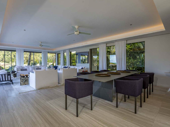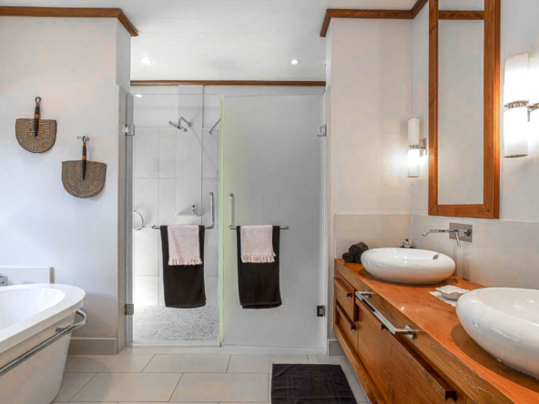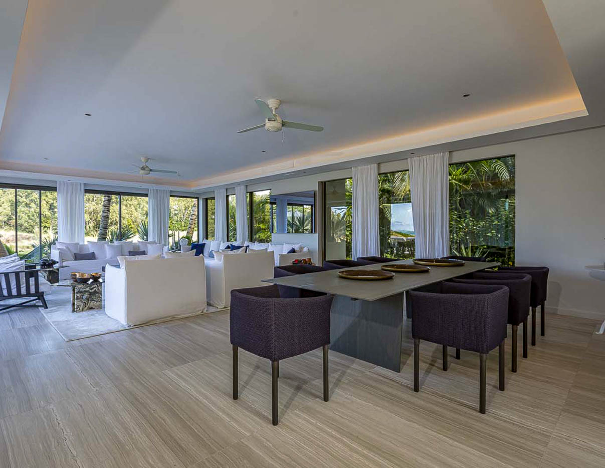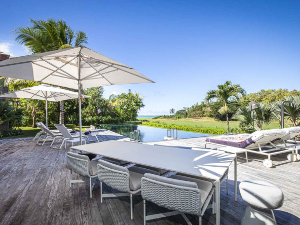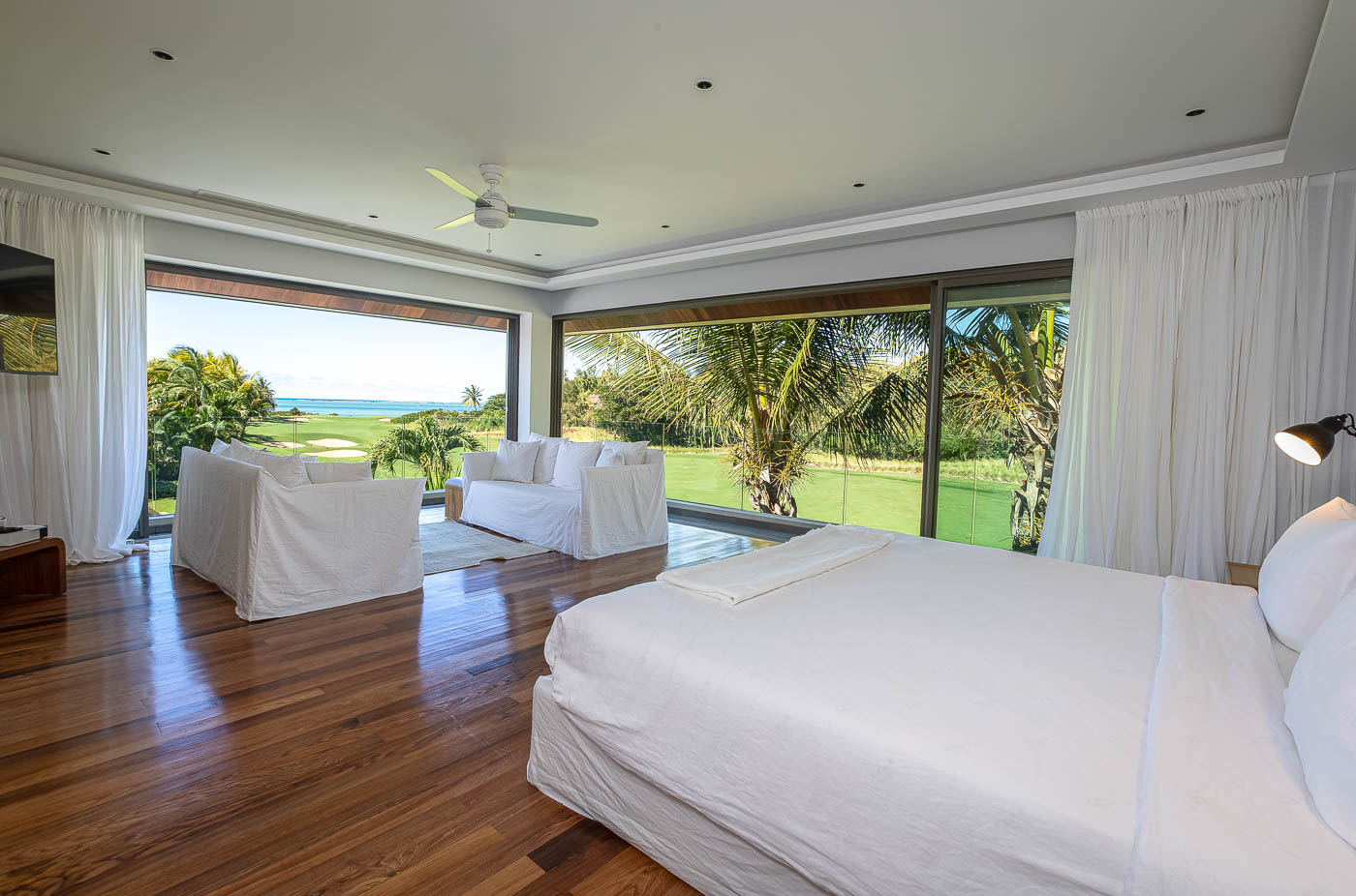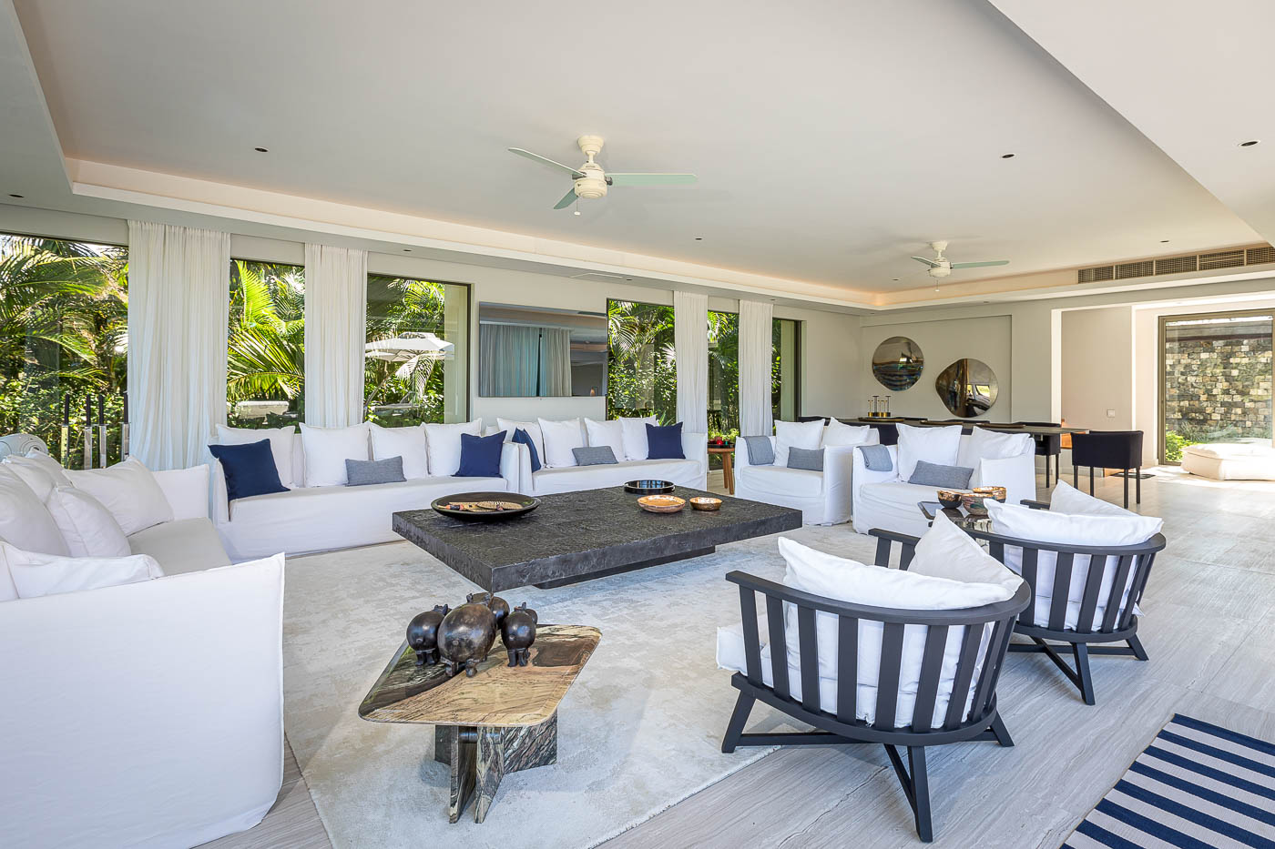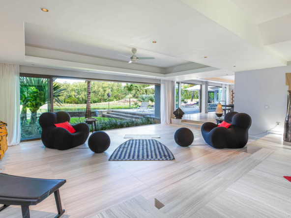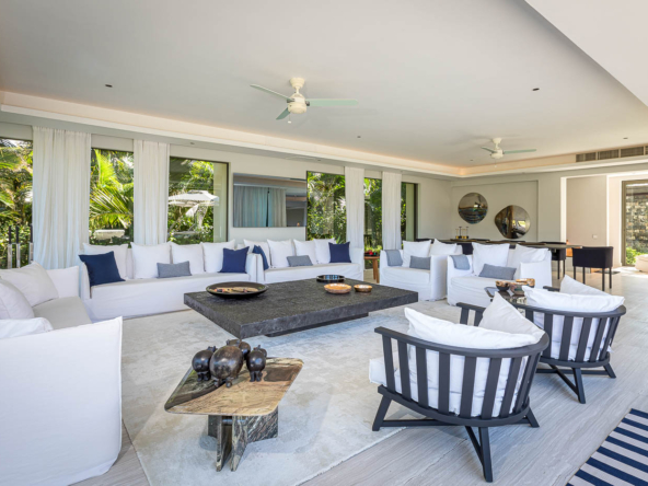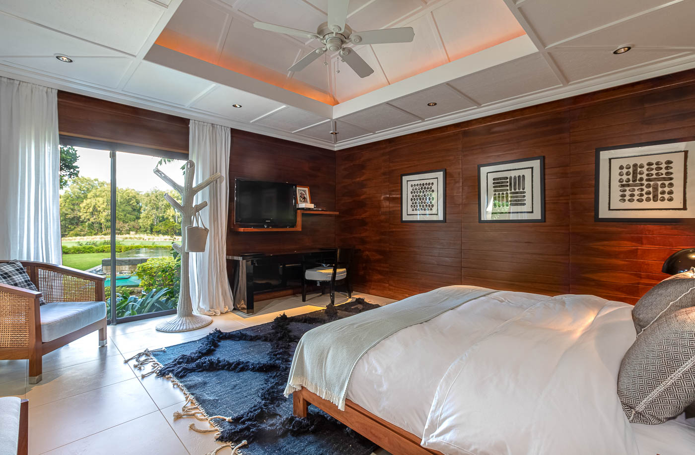 Récemment rénovée et subtilement agrandie, elle s’inscrit dans un environnement apaisant où les lignes modernes flirtent avec la végétation tropicale. Ses 589 m² habitables révèlent une composition élégante, entre matériaux nobles et volumes généreux. Depuis le salon ou la suite parentale de l’étage, le regard embrasse un tableau vivant : piscine à débordement de 15 mètres, nature verdoyante, quatrième trou du golf et, au loin, le lagon qui capte la lumière. L’intérieur conjugue sobriété contemporaine et touches artisanales. Marbre italien, mobilier de créateurs, œuvres choisies : chaque détail raconte une histoire d’harmonie et de confort discret. Les cinq suites, indépendantes et lumineuses, invitent à partager l’espace sans en troubler la quiétude.