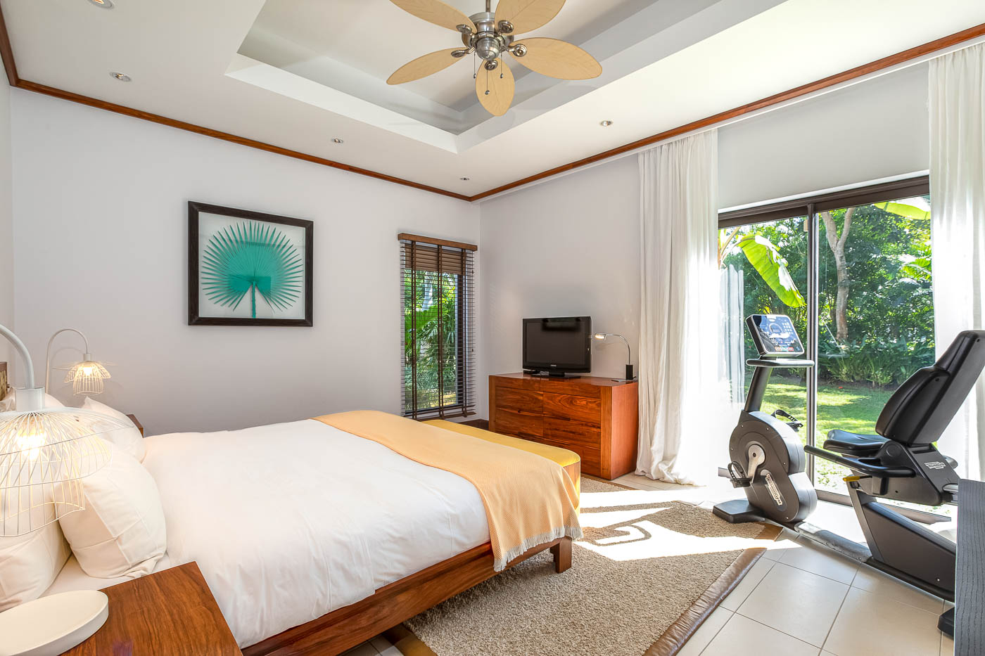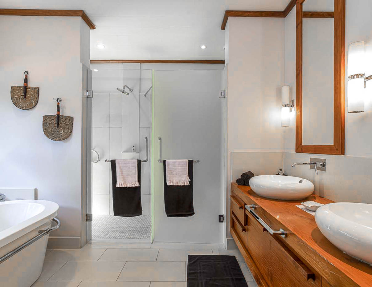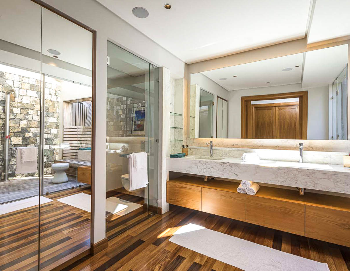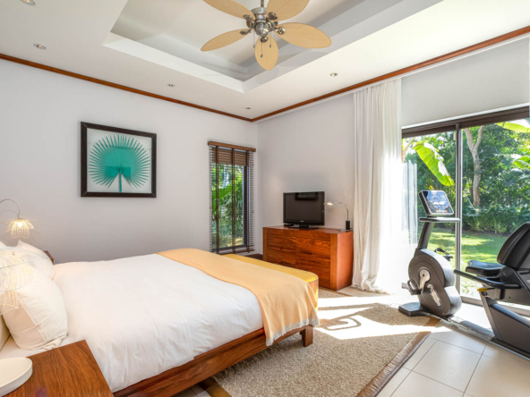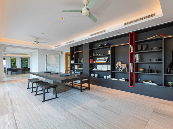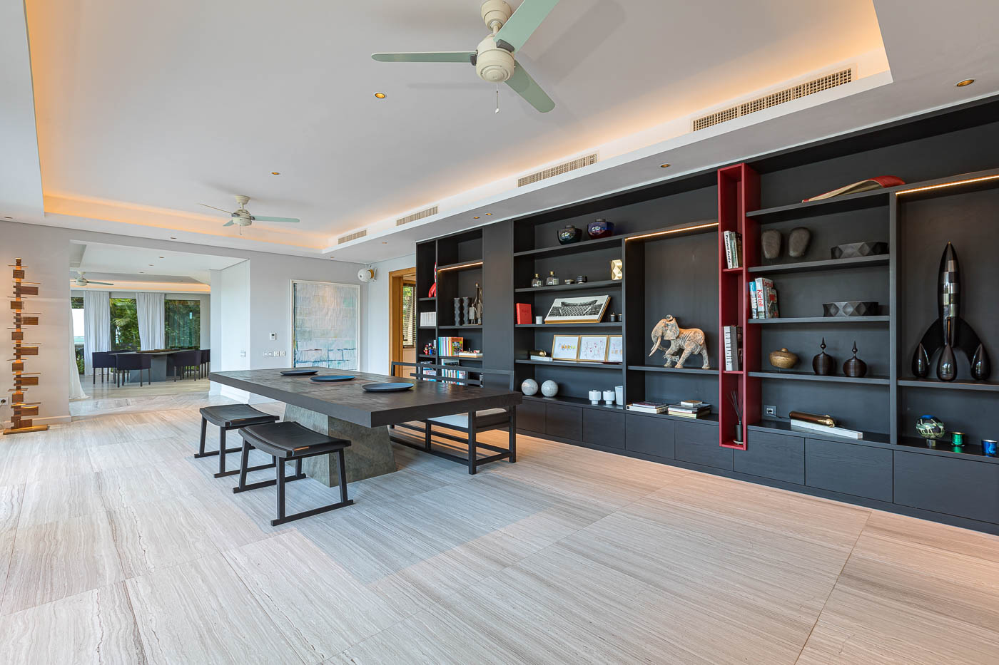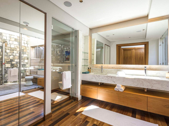 Récemment rénovée et subtilement agrandie, elle s’inscrit dans un environnement apaisant où les lignes modernes flirtent avec la végétation tropicale. Ses 589 m² habitables révèlent une composition élégante, entre matériaux nobles et volumes généreux. Depuis le salon ou la suite parentale de l’étage, le regard embrasse un tableau vivant : piscine à débordement de 15 mètres, nature verdoyante, quatrième trou du golf et, au loin, le lagon qui capte la lumière. L’intérieur conjugue sobriété contemporaine et touches artisanales. Marbre italien, mobilier de créateurs, œuvres choisies : chaque détail raconte une histoire d’harmonie et de confort discret. Les cinq suites, indépendantes et lumineuses, invitent à partager l’espace sans en troubler la quiétude.