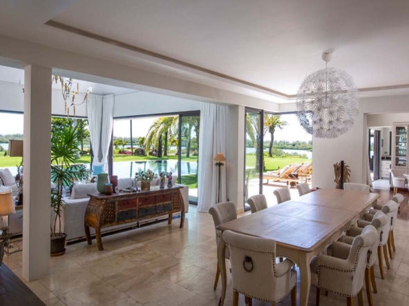 Dès les premiers pas, l’atmosphère invite à la contemplation. Le jardin, foisonnant et mature, semble flotter au-dessus du plus grand lagon de l’île Maurice, offrant un spectacle vivant que la villa épouse avec une élégance discrète. Le murmure du vent dans les arbres, la lumière jouant sur l’eau, et la proximité immédiate du parcours de golf renommé dessinent une douceur de vivre unique.